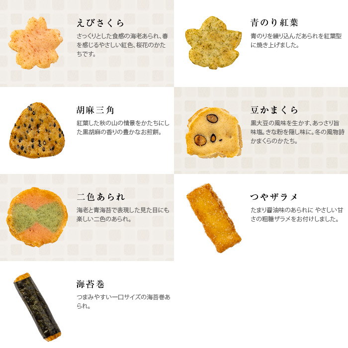 7種類の味・形・食感の違う、あられ・お煎餅を一袋にお詰め合わせした人気の商品です。