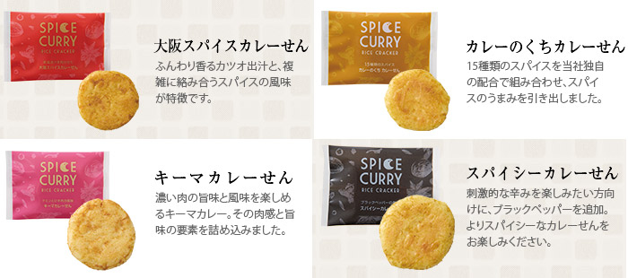 大阪スパイスカレーせん、カレーのくちカレーせん、キーマカレーせん、スパイシーカレーせんを詰め合わせました。