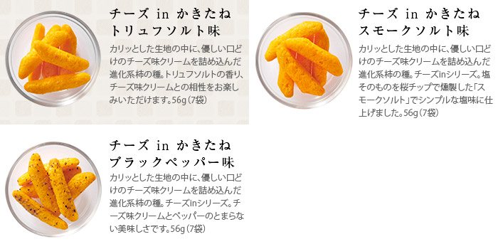 カリッとした生地の中に、優しい口どけのチーズ味クリームを詰め込んだ進化系柿の種、チーズinシリーズ。