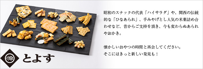 「とよすあられ」は明治三十五年、大阪の阿波座で、米菓の炭焼き工房として創業いたしました。 「とよす」はお米とともに歩んできた誇りにかけて、米菓に最適なお米を選び、国産米100%の、おいしい「あられ」「おかき」「せんべい」を、自信を持ってお届けいたします。